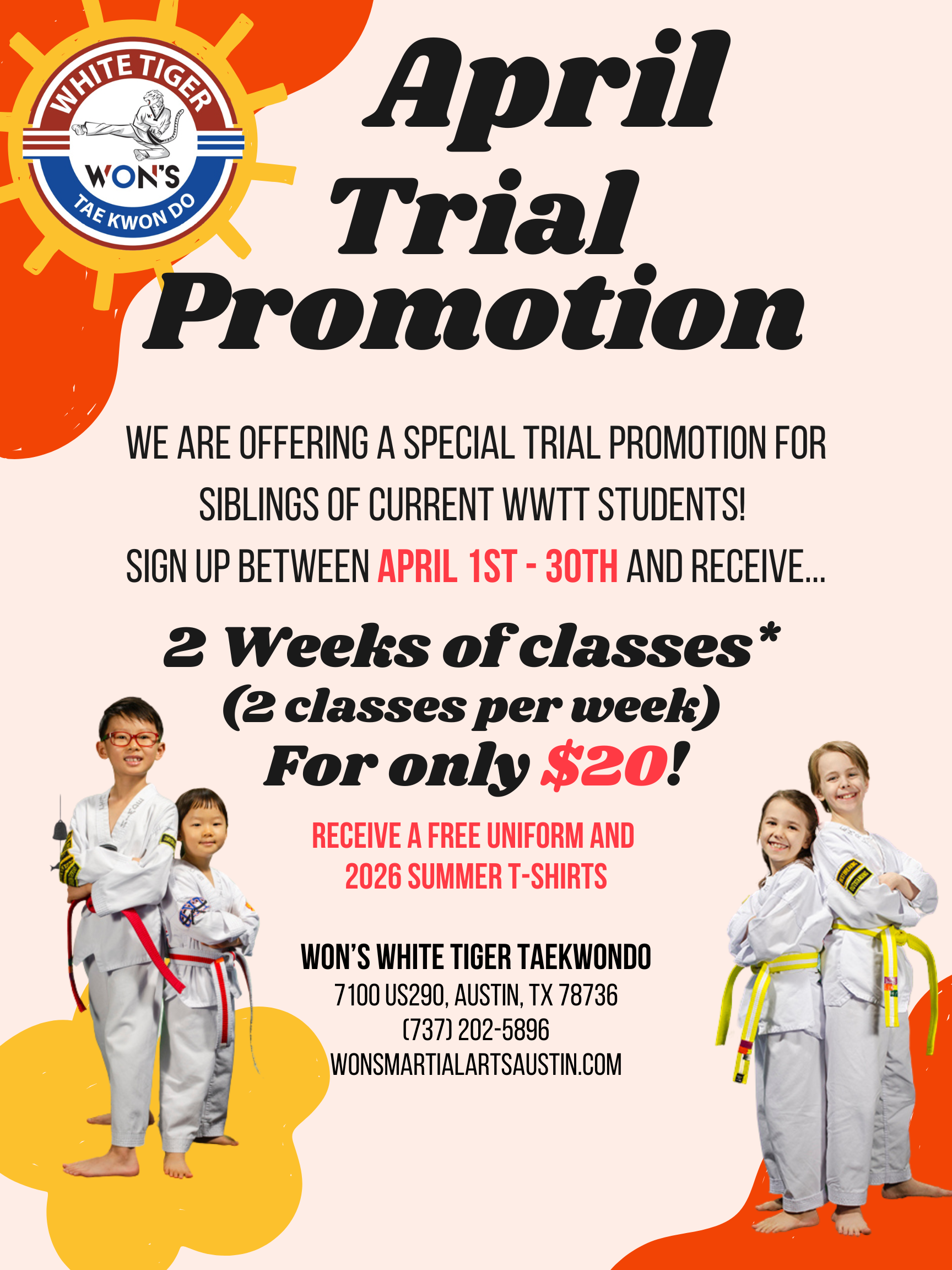 Get started now with one of our WEB SPECIALS and find out how you can be healthier, happier, and more confident with Won’s White Tiger Taekwondo training!